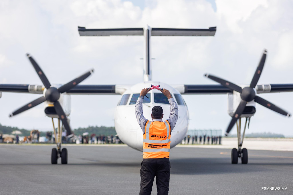ޓްސްޓު ފްލައިޓްގެ ގޮތުގައި މުލީ އެއަޕޯޓަށް ޖައްސާފައި މިވަނީ ޤައުމީ އެއަލައިން، މޯލްޑިވިއަންގެ ޑޭޝް-8 މަރުކާގެ ބޯޓެކެވެ.