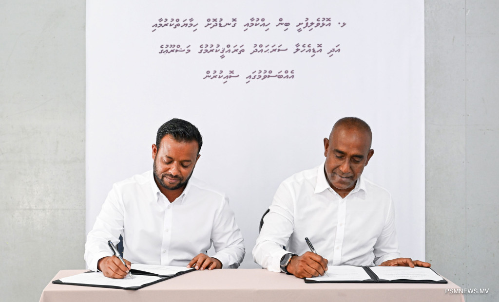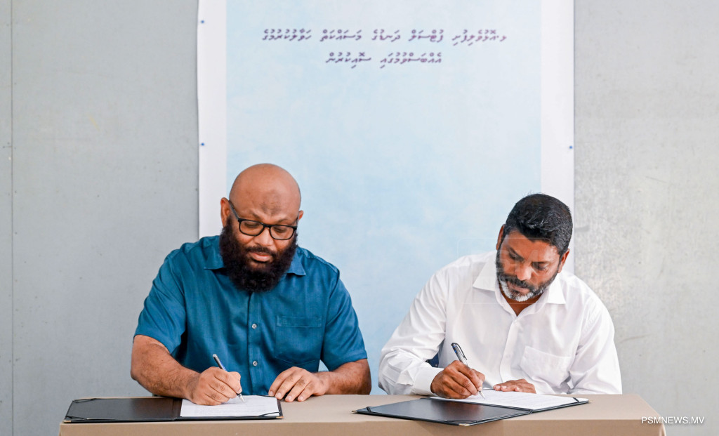 ޅ. އޮޅުވެލިފުށީ ބިން ހިއްކުމާއި ގޮނޑުދޮށް ހިމާޔަތްކުރުމާއި އަދި އޮޑިއެހެލާ ސަރަޙައްދު ތަރައްޤީކުރުމުގެ މަޝްރޫޢު މަސައްކަތް އެމްޓީސީސީއާ ހަވާލުކުރުމުގެ އެއްބަސްވުމުގައި ގެދޮރުވެރިކަމާއި ބިނާރާ ބެހޭ ވަޒީރު ޑރ. ޢަބްދުﷲ މުއްޠަލިބު އަދި އެމްޓީސީސީގެ ފަރާތުން ސޮއިކުރެއްވީ އެކުންފުނީގެ މެނޭޖިންގ ޑިރެކްޓަރ ޑީޕީސީ (ރޓ) އަހްމަދު ސައުދީ ސޮއިކުރައްވުމަށްފަހު / ފޮޓޯ - ރައީސް އޮފީސް