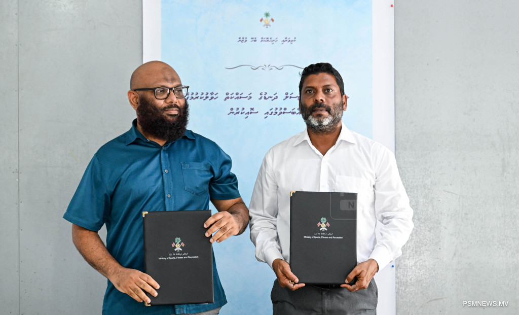 ޅ. އޮޅުވެލިފުށީގައި އިމާރާތްކުރާ ފުޓްސަލް ދަނޑު މަސައްކަތް ހަވާލުކުރުމުގެ އެއްބަސްވުމުގައި ކުޅިވަރާއި ހަށިހެޔޮކަމާ ބެހޭ ވަޒީރު ޢަބްދުﷲ ރާފިޢު (ކ) އަދި ޕްރޮކްސީ ގުރޫޕްގެ މެނޭޖިންގ ޑިރެކްޓަރ އަޙްމަދު ޝާހިދު ސޮއި ކުރެއްވުމަށްފަހު / ފޮޓޯ - ރައީސް އޮފީސް