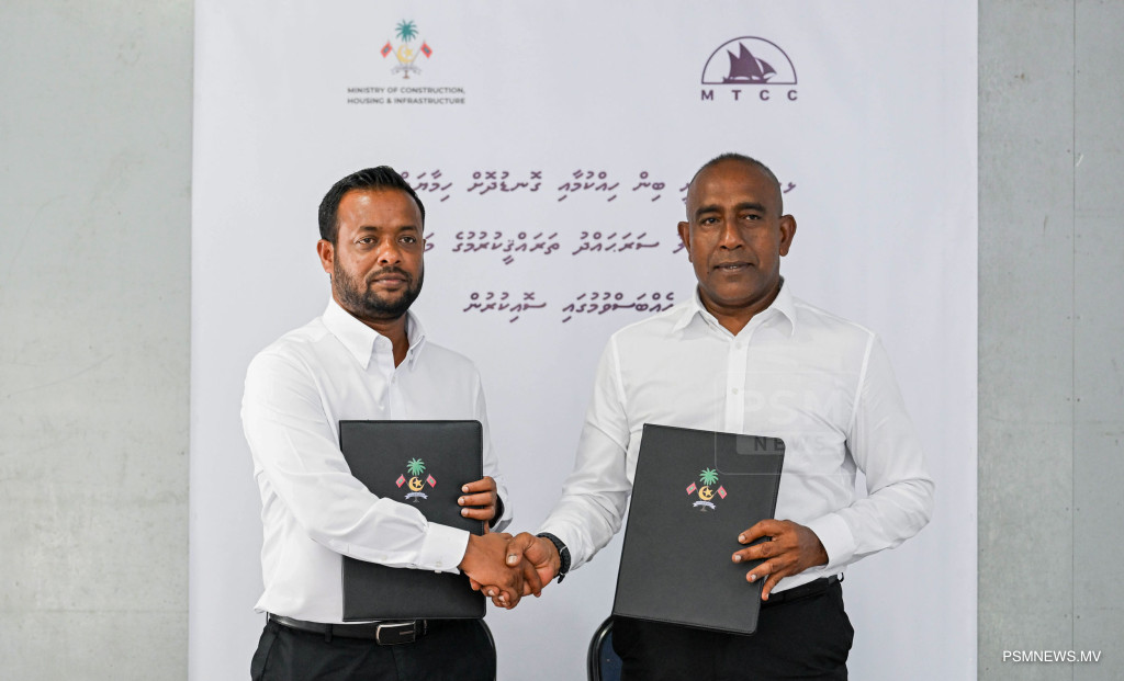 ޅ. އޮޅުވެލިފުށީ ބިން ހިއްކުމާއި ގޮނޑުދޮށް ހިމާޔަތްކުރުމާއި އަދި އޮޑިއެހެލާ ސަރަޙައްދު ތަރައްޤީކުރުމުގެ މަޝްރޫޢު މަސައްކަތް އެމްޓީސީސީއާ ހަވާލުކުރުމުގެ އެއްބަސްވުމުގައި ގެދޮރުވެރިކަމާއި ބިނާރާ ބެހޭ ވަޒީރު ޑރ. ޢަބްދުﷲ މުއްޠަލިބު އަދި އެމްޓީސީސީގެ ފަރާތުން ސޮއިކުރެއްވީ އެކުންފުނީގެ މެނޭޖިންގ ޑިރެކްޓަރ ޑީޕީސީ (ރޓ) އަހްމަދު ސައުދީ ސޮއިކުރައްވަނީ / ފޮޓޯ - ރައީސް އޮފީސް