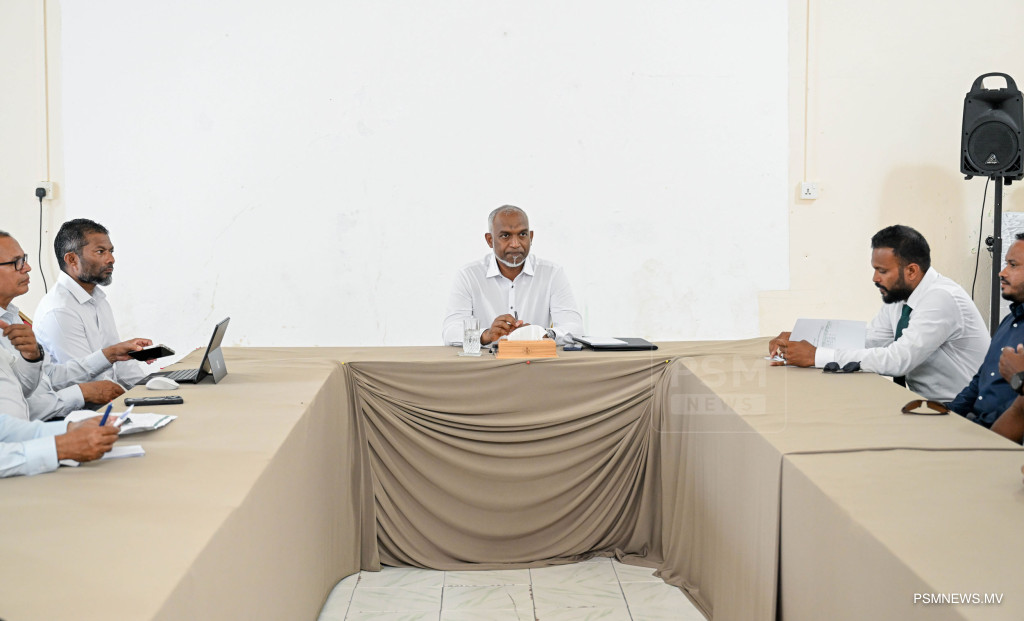 ރައީސުލްޖުމްހޫރިއްޔާ ޑރ. މުޙައްމަދު މުޢިއްޒު ޅ. އޮޅުވެލިފުށީ ކައުންސިލާއި، އ.ތ.މ ކޮމިޓީ އަދި ރަށުގެ މުއައްސަސާތަކުގެ އިސްވެރިންނާއި ބައްދަލުކުރެއްވުމުގެ ތެރެއިން / ފޮޓޯ - ރައީސް އޮފީސް