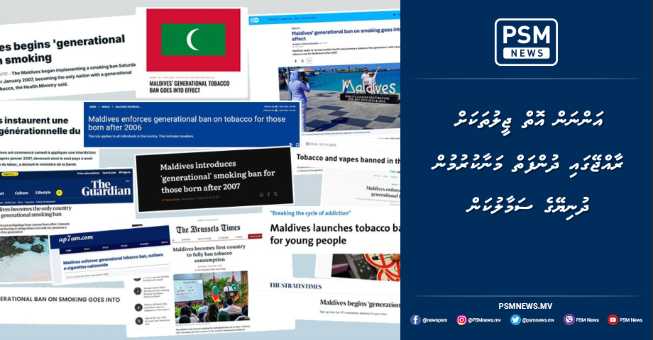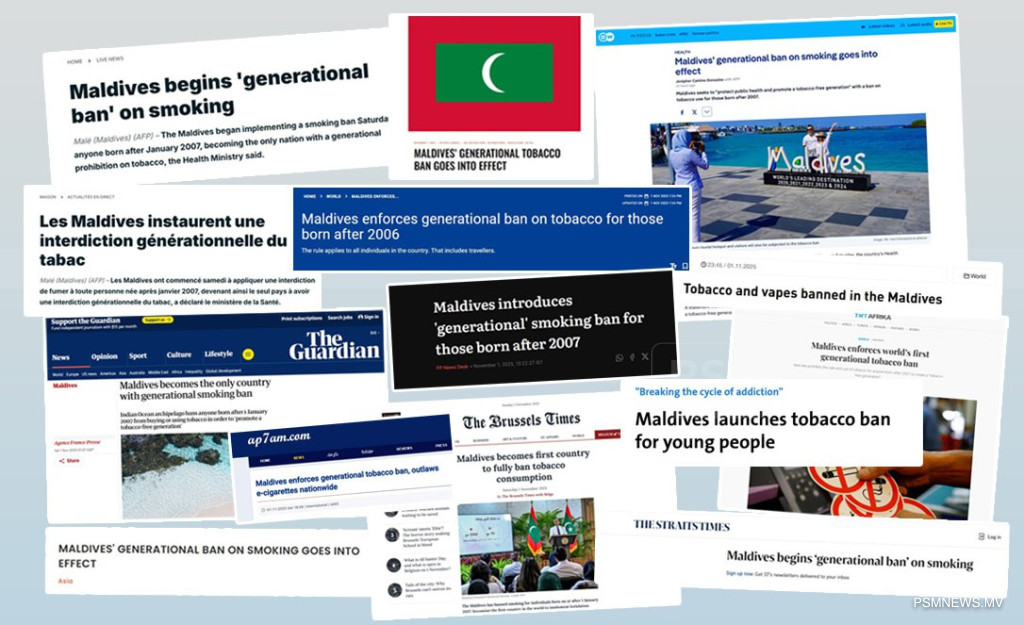 އެންމެފަހުން ބައިނަލްއަޤްވާމީ މީޑިއާއާއި ދުނިޔޭގެ ސަމާލުކަން ލިބިގެންދިޔައީ އަންނާން އޮތް ޖީލުތަކަށް ރާއްޖޭގައި ދުންފަތް މަނާކުރުމުގެ ގޮތުން ޖެނެރޭޝަނަލް ބޭންއެއް ތަންފީޒުކުރަން ފެށުމުންނެވެ. ރައީސުލްޖުމްހޫރިއްޔާ ޑރ. މުޙައްމަދު މުޢިއްޒުގެ މި ނިންމެވުން ފާހަގަކޮށް، ދުނިޔޭގެ ޞިއްޙަތު ޖަމިއްޔާގެ އިތުރުން ގިނަ ބަޔަކުވެސް ދަނީ ސަރުކާރަށް ތަޢުރީފުކުރަމުންނެވެ. މީގެއިތުރުން ދުނިޔޭގައިވެސް އަލަށް ޤައުމެއްގައި ދުންފަތާއި ދެކޮޅަށް ޖެނެރޭޝަނަލް ބޭންއެއް ތަންފީޒުކުރަން ފެށި ޤައުމަކަށް ރާއްޖެވުމާއެކު ދުނިޔޭގެ ބޮޑެތި ހުރިހާ މީޑިއާތަކެއްގައިވެސް އެއީ ރަނގަޅުކަމެއްގެ ގޮތުގައި ފާހަގަކޮށް، އެކަމާއި ގުޅުންހުރި ޚަބަރުތައް ގެނެސްދީފައެވެ.