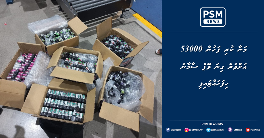 އިލެކްޓްރޯނިކް ސިނގިރެޓާއި ވޭޕްކުރުމަށް ބޭނުންކުރާ އާލާތްތައް ރާއްޖެއަށް އެތެރެކުރުން މަނާ ކުރި ފަހުން، މިހާތަނަށް 53000އަށްވުރެ ގިނަ ވޭޕް ސާމާނު ހިފެހެއްޓި ކަމަށް މޯލްޑިވްސް ކަސްޓަމްސް ސަރވިސްއިން ވިދާޅުވެއްޖެއެވެ.