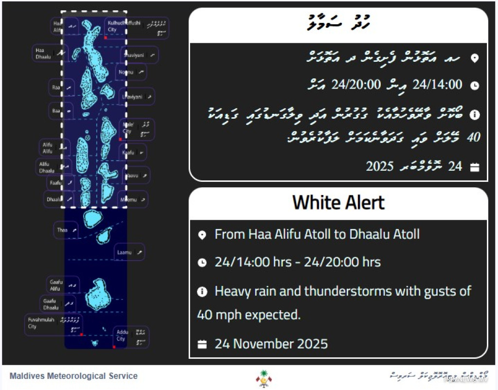 މުޅި ރާއްޖެއަށް ކުރިއަށް އޮތް ތިން ދުވަހަށް މޫސުން ގޯސްވާނެކަމާއި، އަދި ޚާއްޞަކޮށް މުޅިރާއްޖެއަށް އާންމުގޮތެއްގައި ވައިބާރުވެ، ވިއްސާރަވެ، ކަނޑުތައް ގަދަވާނެކަމަށް، މޫސުމާ ބެހޭ ގައުމީ އިދާރާއިން ލަފާކޮށްފައި ވާތީ، ކަނޑު ދަތުރުފަތުރުކުރާ ފަރާތްތަކުން މޫސުމަށް ސަމާލުކަންދެއްވުމަށް އެމްއެންޑީއެފުންވަނީ އިލްތިމާސްކުރައްވާފައެވެ.