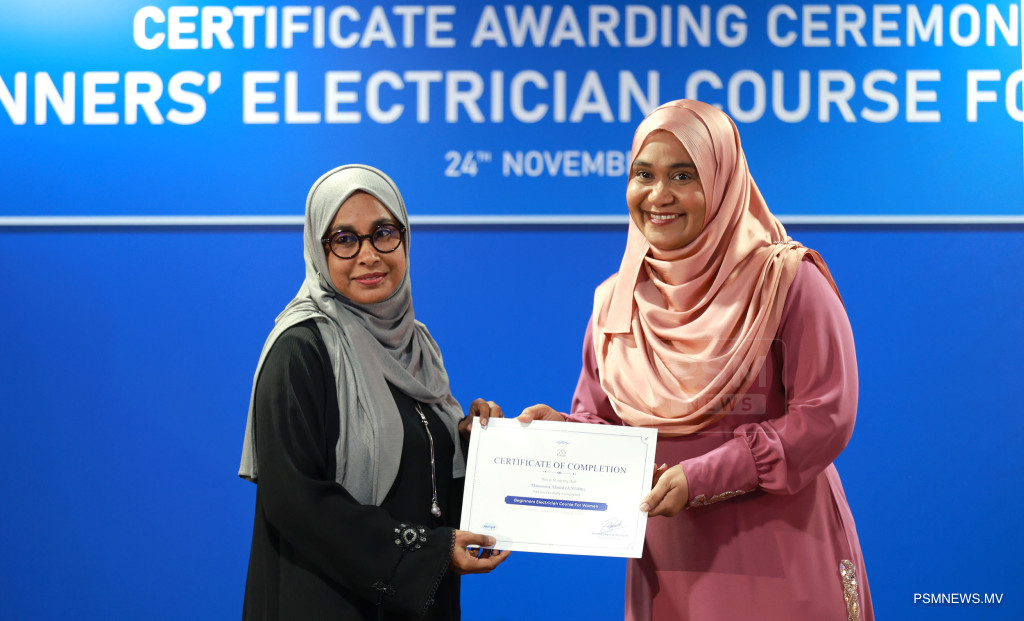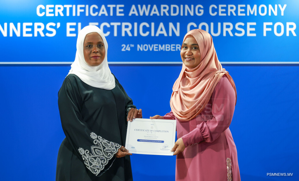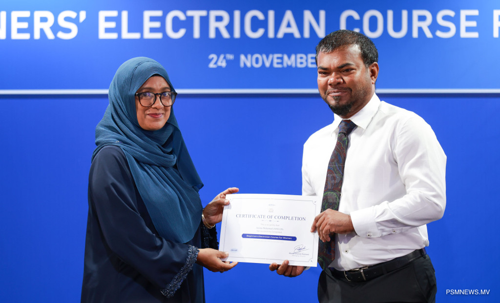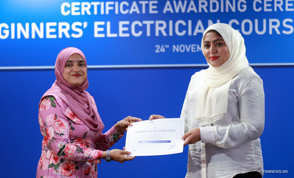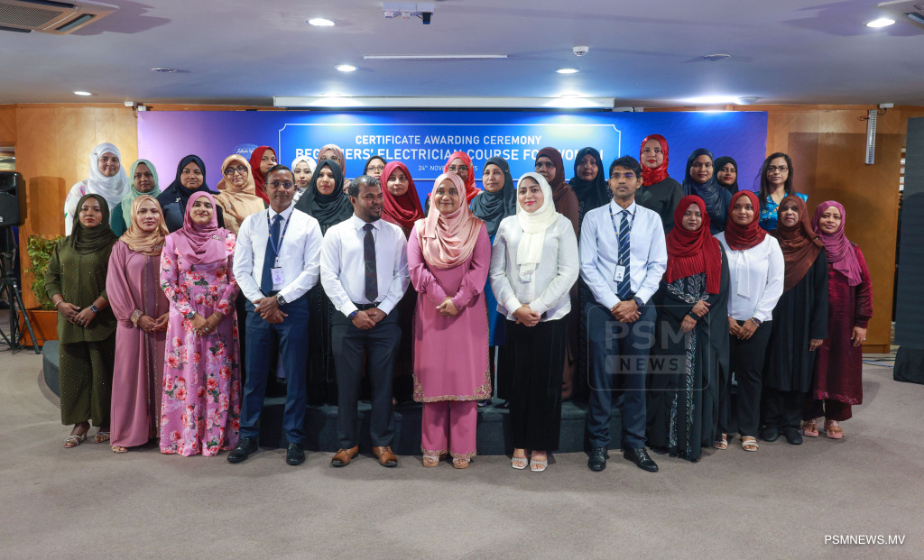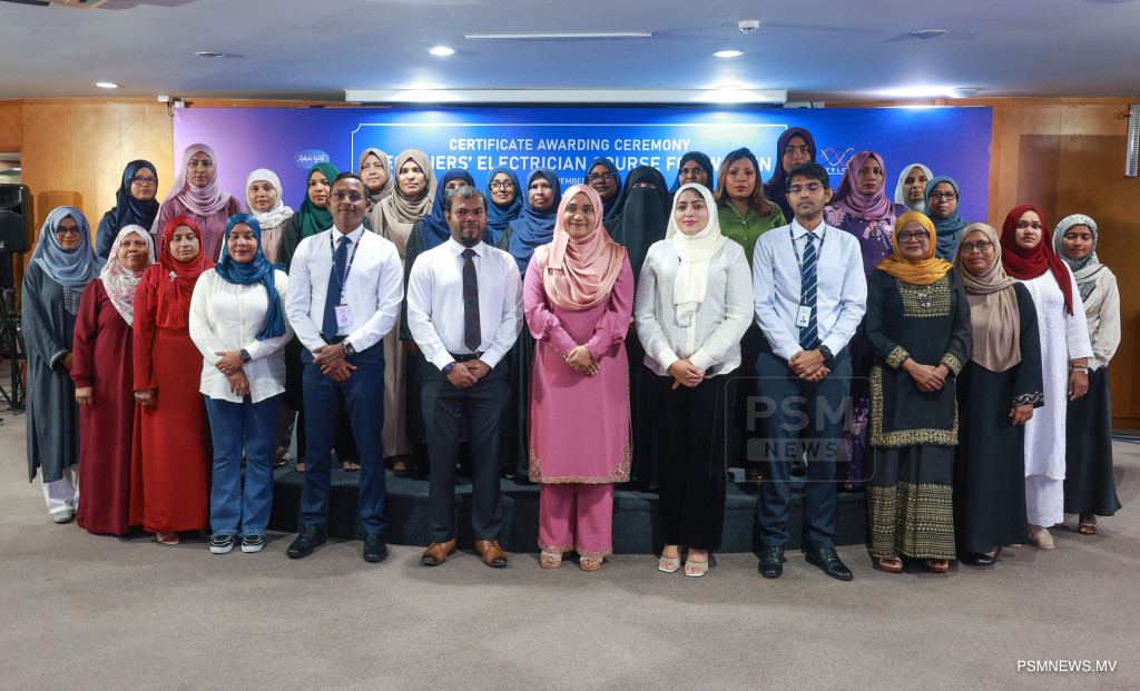 ފަށާ ފެންވަރުގެ ކަރަންޓު މަސައްކަތުގެ ކޯސް ނިމުމުގެ ރަސްމިއްޔާތު. އާއްމުކޮށް ހުޅުވާލައިގެން ސްޓެލްކޯއިން ކުރިއަށްގެން މި ޕްރޮގްރާމް 116 އަންހެނުން ފުރިހަމަކޮށްފައިވޭ / ފޮޓޯ: މުޙައްމަދު ވަޙީދު، ޕީއެސްއެމް ނިއުސް