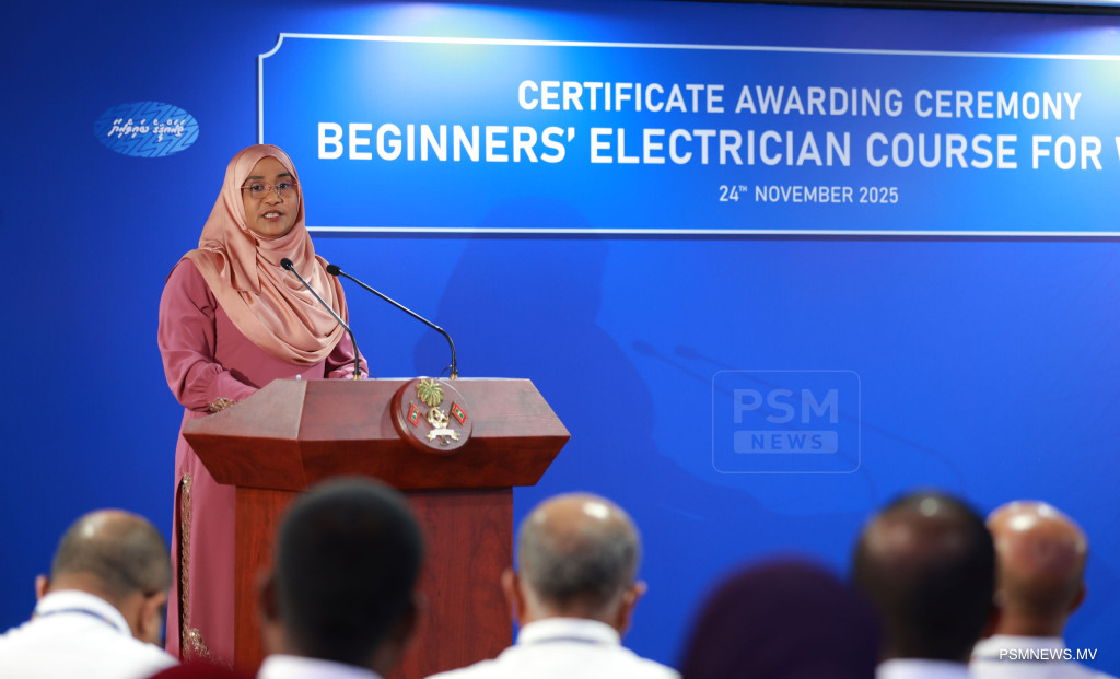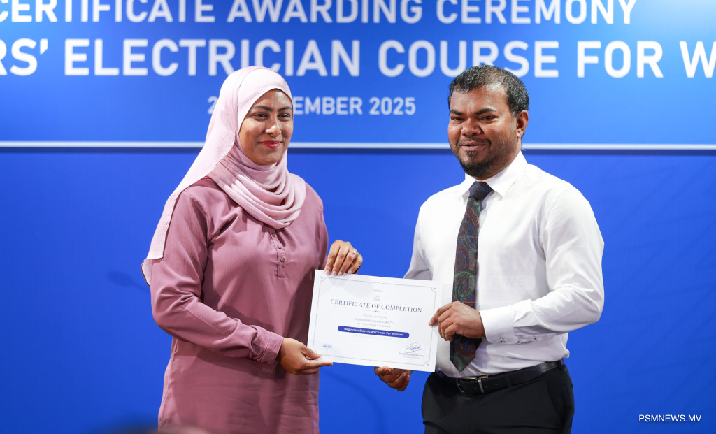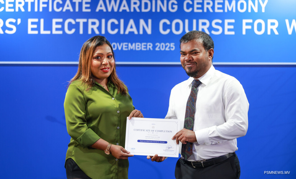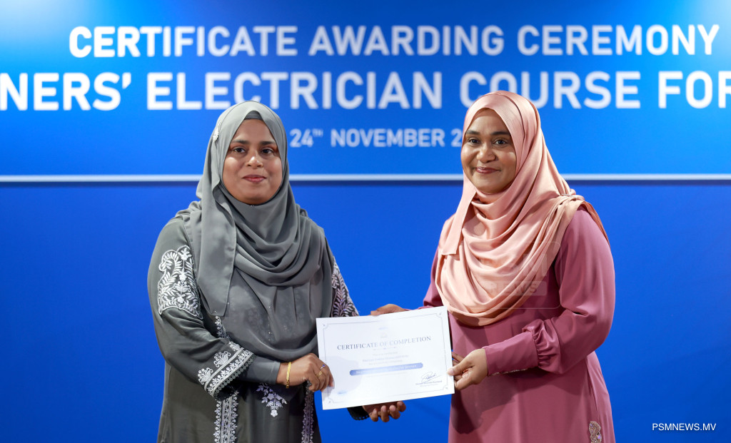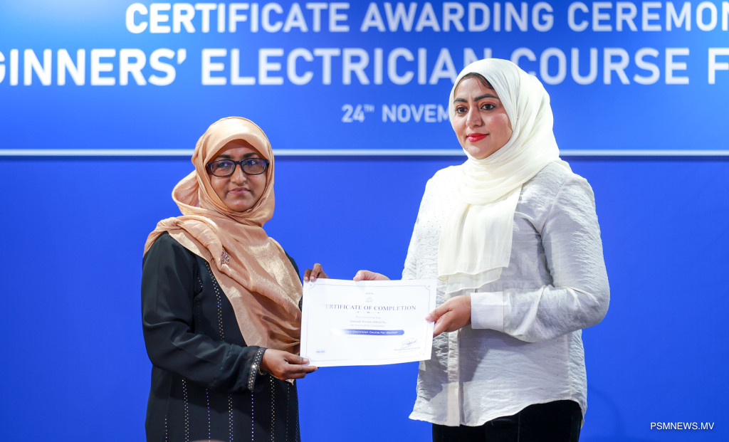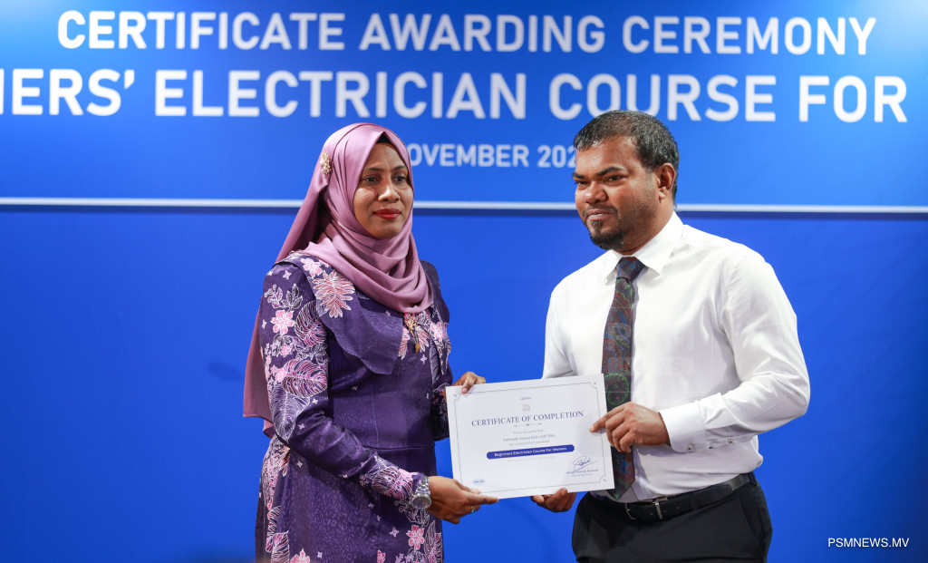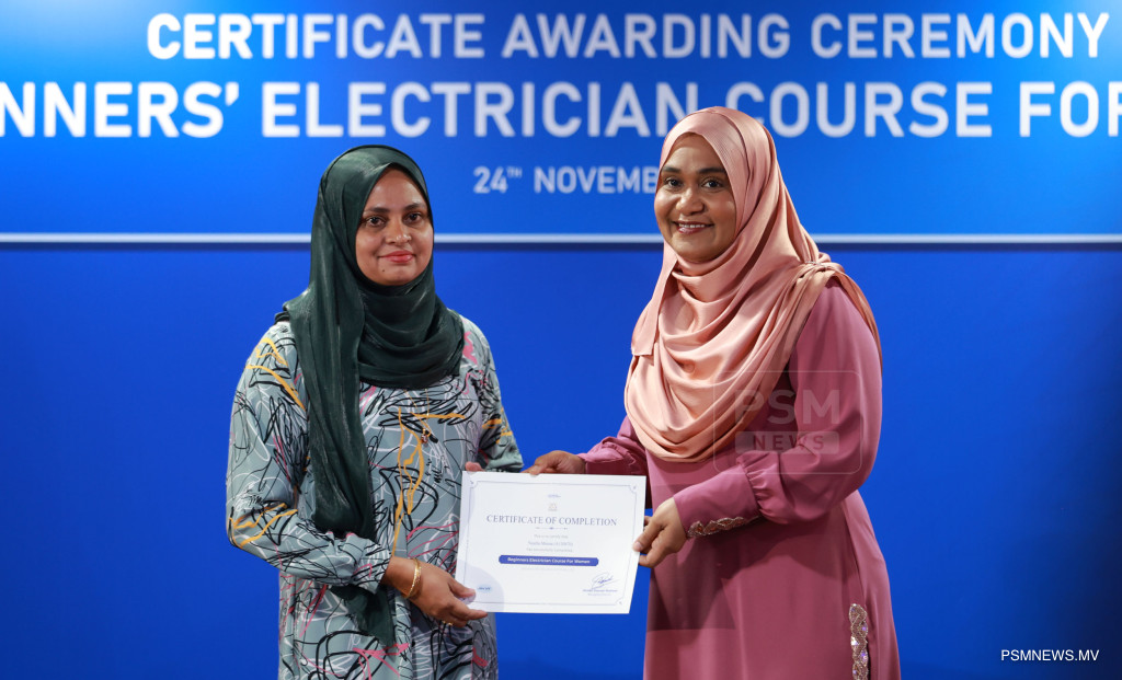 ފަށާ ފެންވަރުގެ ކަރަންޓު މަސައްކަތުގެ ކޯސް ނިމުމުގެ ރަސްމިއްޔާތު. އާއްމުކޮށް ހުޅުވާލައިގެން ސްޓެލްކޯއިން ކުރިއަށްގެން މި ޕްރޮގްރާމް 116 އަންހެނުން ފުރިހަމަކޮށްފައިވޭ / ފޮޓޯ: މުޙައްމަދު ވަޙީދު، ޕީއެސްއެމް ނިއުސް