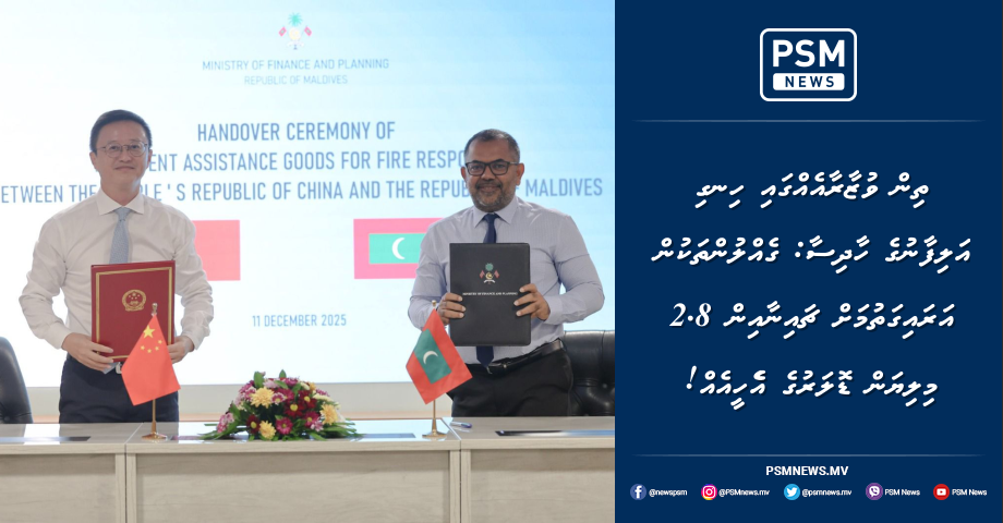 މިދިޔަ އަހަރުގެ ޑިސެންބަރު މަހުގެ 12ވަނަ ދުވަހު އޭރު 3 ވުޒާރާއެއް ހިންގަމުންދިޔަ އިމާރާތްތަކުގައި ހިނގި އަލިފާނުގެ ހާދިސާގައި ލިބުނު ގެއްލުންތަކުން އަރައިގަތުމަށް 2.8 މިލިޔަން ޑޮލަރުގެ އެހީއެއް ޗައިނާ ސަރުކާރުން ދެއްވައިފިއެވެ.