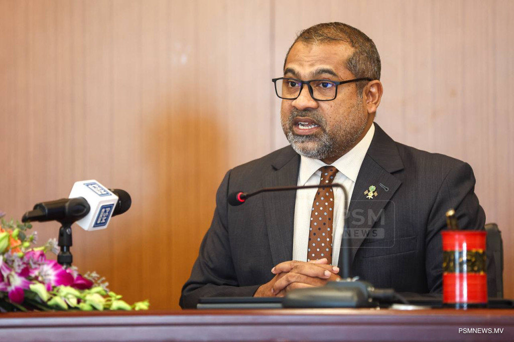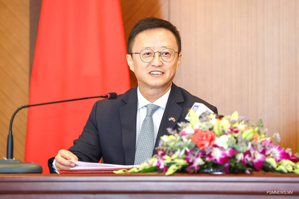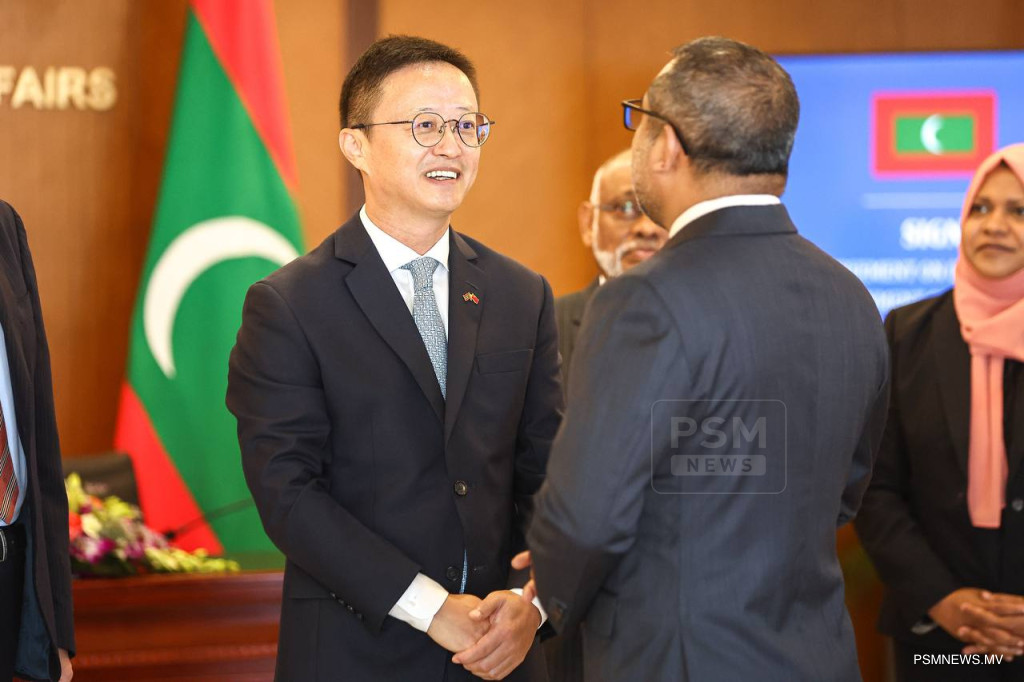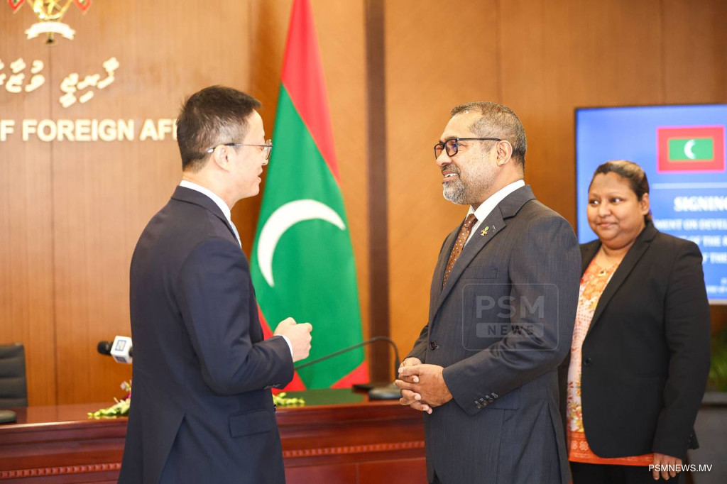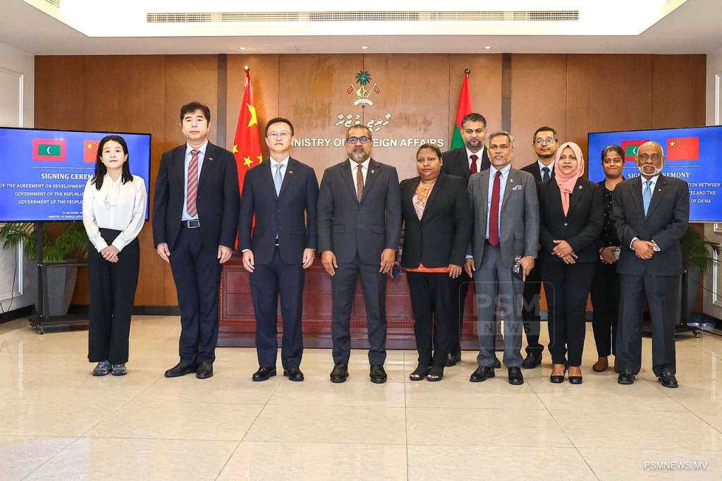 ޗައިނާއިން ރާއްޖެއަށް ތަރައްޤީގެ މަޝްރޫޢުތައް ކުރިއަށް ގެންދަން 85 މިލިޔަން ޑޮލަރުގެ ހިލޭ އެހީދިނުމުގެ އެއްބަސްވުމުގައި ސޮއިކުރުމުގެ ތެރެއިން، ފޮޓޯ: ޖަލްވާން ޖަމީލް، ޕީއެސްއެމް ނިއުސް