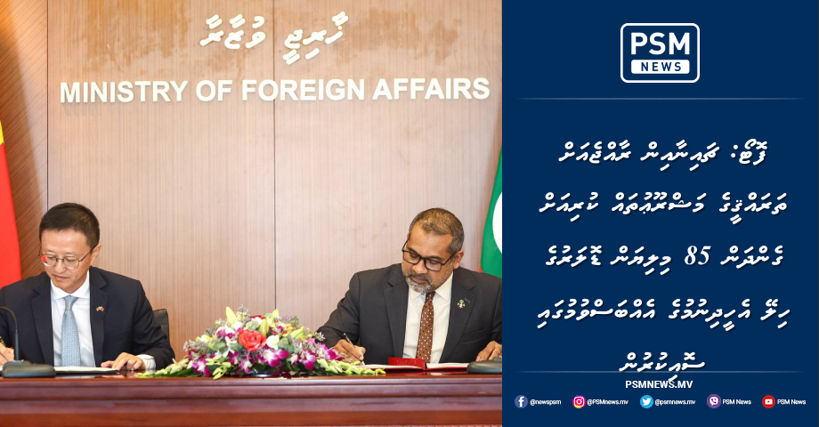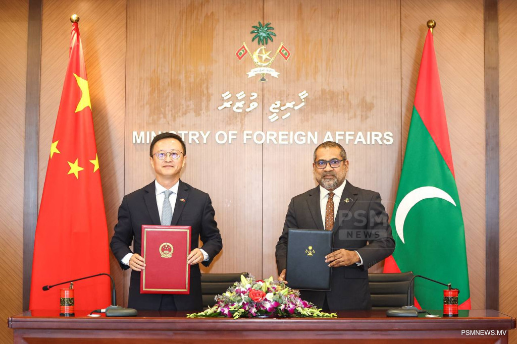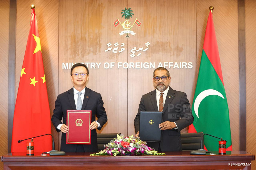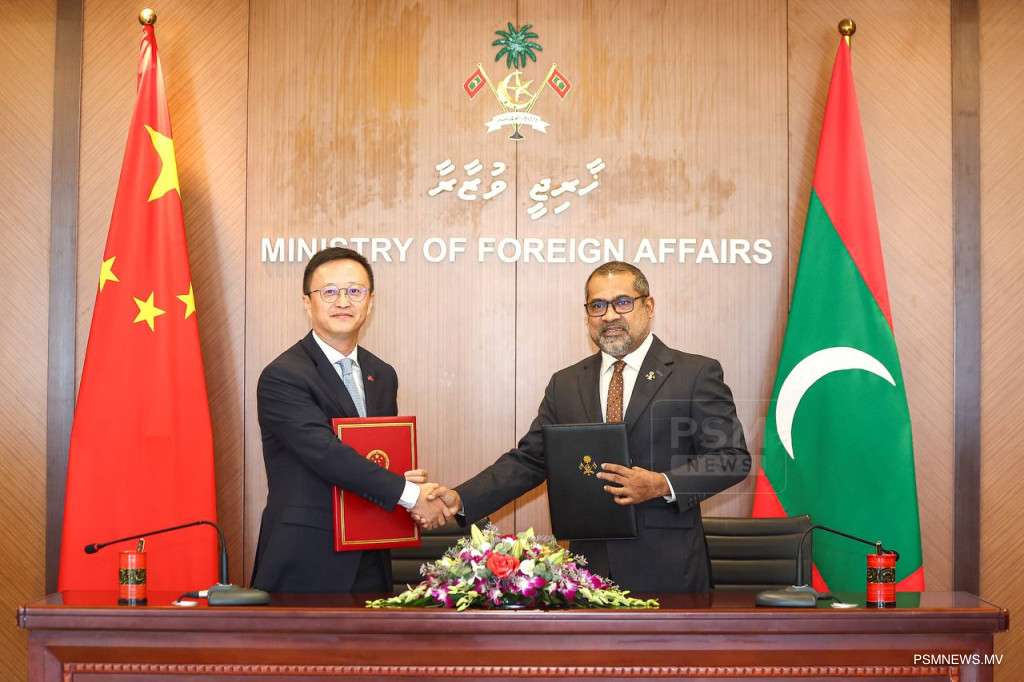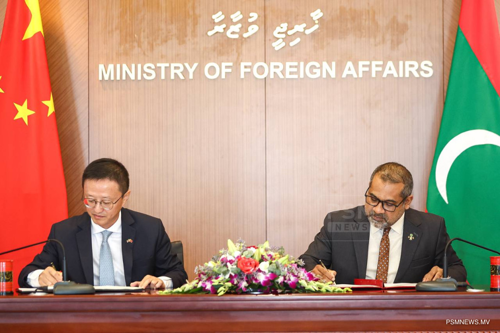 ފޮޓޯ: ޗައިނާއިން ރާއްޖެއަށް ތަރައްޤީގެ މަޝްރޫޢުތައް ކުރިއަށް ގެންދަން 85 މިލިޔަން ޑޮލަރުގެ ހިލޭ އެހީދިނުމުގެ އެއްބަސްވުމުގައި ސޮއިކުރުން