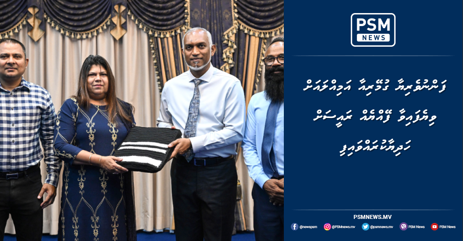 އަތްތެރިމަސައްކަތުގެ ފާހަގަކޮށްލެވޭ ފަންނުވެރިިޔާ އާމިނަތު ގުމޭރިއާ އަމިއްލަ އަތުން ވިޔެ ތައްޔާރުކޮށްފައިވާ ދިވެހި ފޭއްޔެއް ރައީސުލްޖުމްހޫރިއްޔާ ޑރ. މުޙައްމަދު މުޢިއްޒުއަށް ހަދިޔާކުރައްވައިފިއެވެ.
