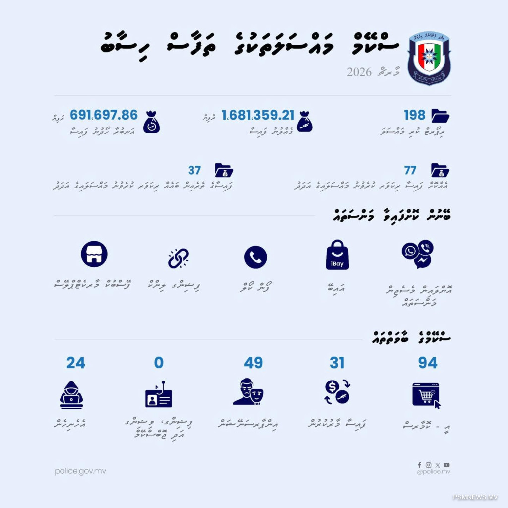 އެގޮތުން އިމްޕަރސަނޭޝަންގެ 49 މައްސަލައަކާއި، ބޭރު ފައިސާ މާރުކުރުމާ ގުޅޭ 31 މައްސަލަ ހުށަހަޅާފައިވެއެވެ. މީގެ އިތުރުން ތަފާތު ލިންކުތައް ފޮނުވައިގެންނާއި، ސްކޭމާ ގުޅުންހުރި އެހެނިހެން މައްސަލަ ހުށަހަޅާފައިވާ ކަމަށް ފުލުހުން ވިދާޅުވެއެވެ.