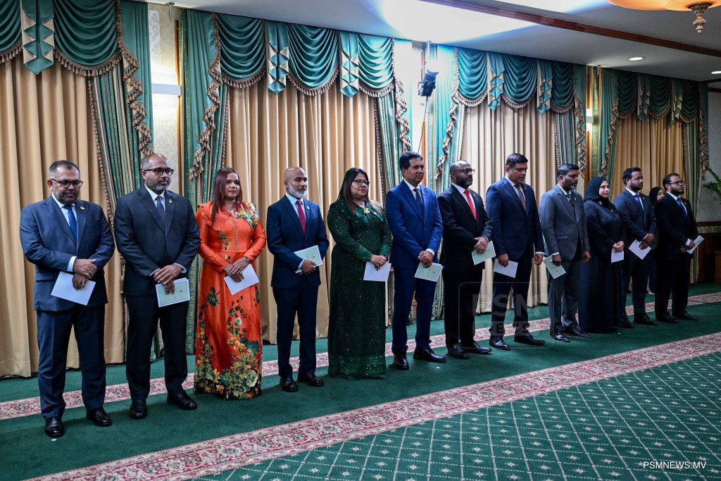 The swearing-in ceremony for the newly appointed ministers was held at the President’s Office this afternoon, with the oath of office administered by the Chief Justice of the Maldives, Abdul Ghanee Mohamed. Following the ceremony, President Dr Muizzu presented the ministers with their letters of appointment.