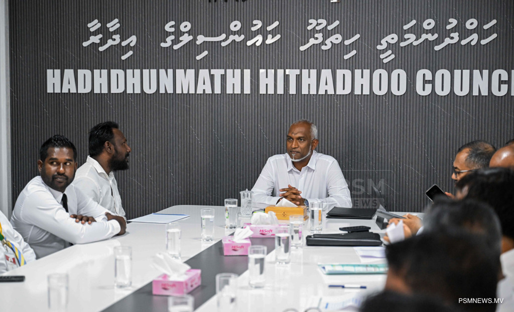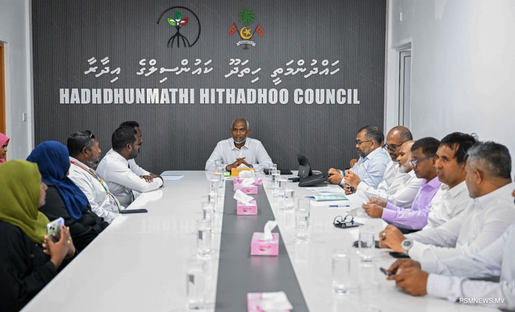 ރައީސުލްޖުމްހޫރިއްޔާ ޑރ. މުޙައްމަދު މުޢިއްޒު ލ. ހިތަދޫ ކައުންސިލާއި، އ.ތ.މ ކޮމިޓީ އަދި ރަށުގެ މުއައްސަސާތަކުގެ އިސްވެރިންނާއި ބައްދަލުކުރެއްވުމުގެ ތެރެއިން / ފޮޓޯ - ރައީސް އޮފީސް