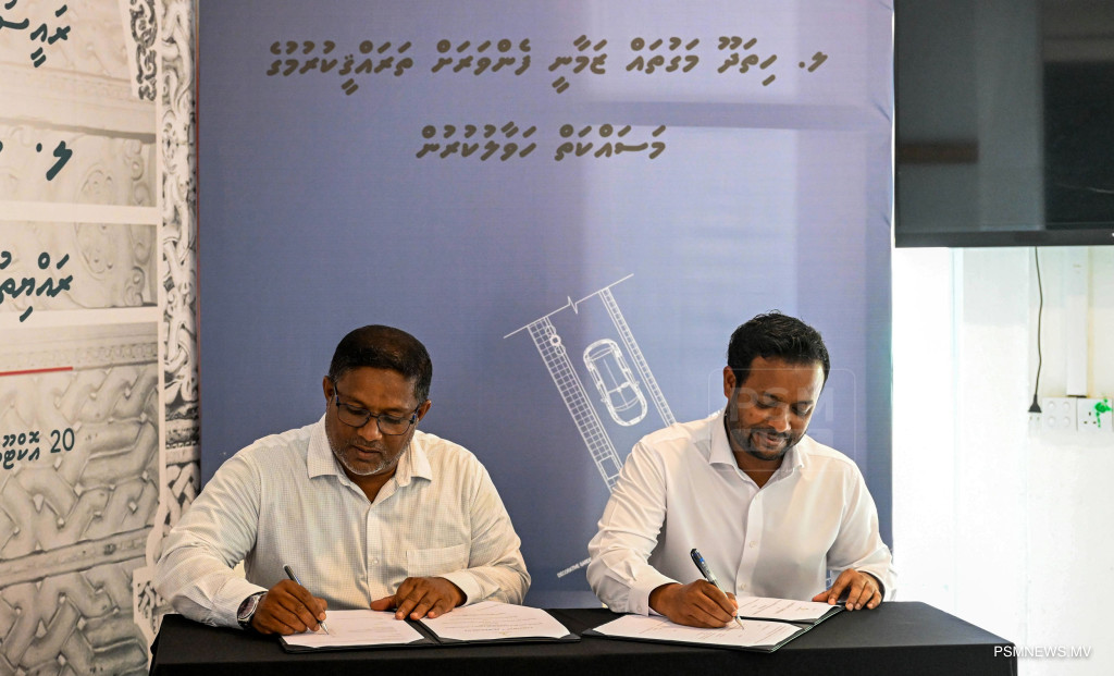 ލ. ހިތަދޫގެ މަގުތައް ޒަމާނީ ފެންވަރަށް ތަރައްޤީކުރުމުގެ މަސައްކަތް ހަވާލުކުރުމުގެ އެއްބަސްވުމުގައި ގެދޮރުވެރިކަމާއި ބިނާރާބެހޭ ވުޒާރާގެ، ވަޒީރު ޑރ. ޢަބްދުﷲ މުއްޠަލިބު އަދި އާރްޑީސީގެ މެނޭޖިންގ ޑިރެކްޓަރ އިބްރާހިމް ނަޒީމެވެ ސޮއިކުރައްވަނީ / ފޮޓޯ - ރައީސް އޮފީސް