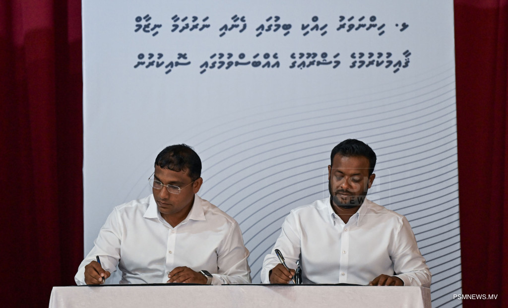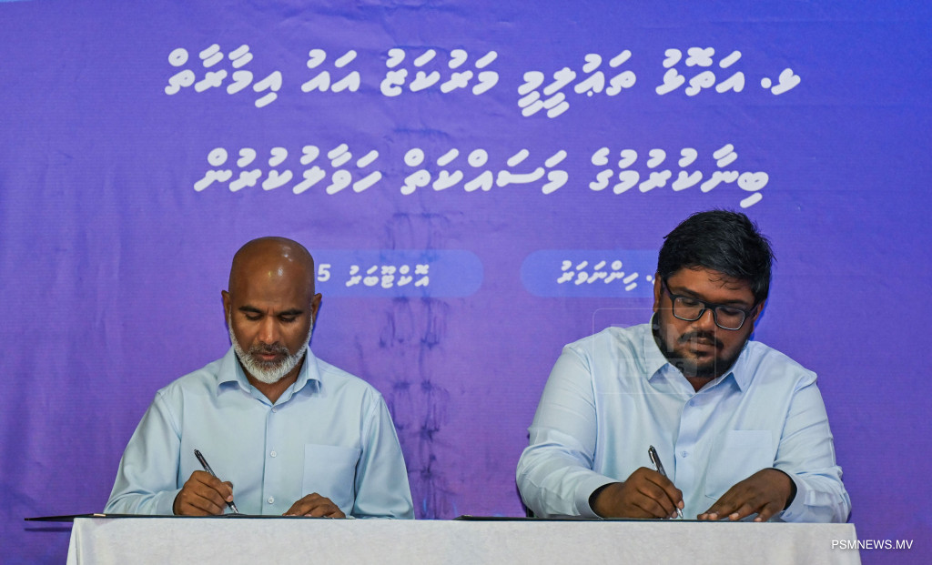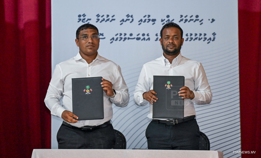 ޅ. ހިންނަވަރުގައި އަލަށް ހިއްކި ސަރަހައްދަށް ފެނާއި ނަރުދަމާ ނިޒާމް ޤާއިމުކުރުމުގެ މަޝްރޫޢުގެ އެއްބަސްވުމުގައި ސޮއިކުރުން / ފޮޓޯ - ރައީސް އޮފީސް