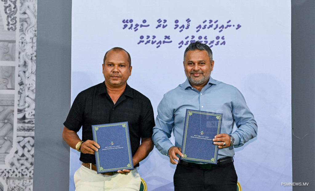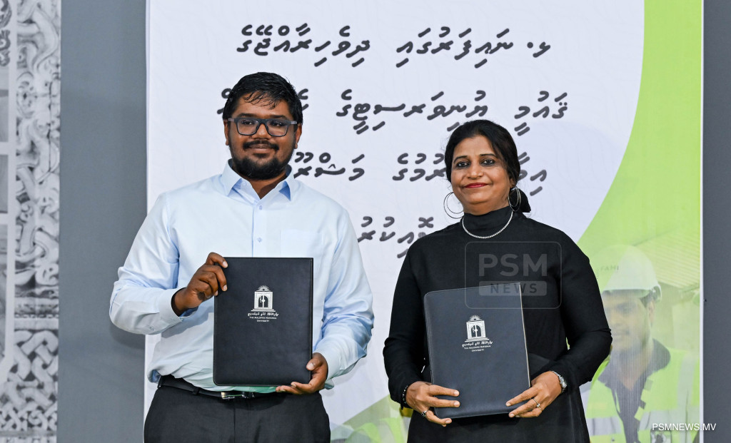 ޅ. ނައިފަރުގައި ދިވެހިރާއްޖޭގެ ޤައުމީ ޔުނިވަރސިޓީގެ ކެމްޕަހެއް ނައިފަރުގައި އިމާރާތްކުރުމުގެ އެއްބަސްވުމުގައި ފަހި ދިރިއުޅުން ކޯޕަރޭޝަންގެ ޑެޕިއުޓީ މެނޭޖިން ޑިރެކްޓަރ އިބްރާހިމް ރައްޒާން އަދި އެމްއެންޔޫގެ ވައިސް ޗާންސެލަރ ޑރ. އައިޝަތު ޝެހެނާޒް އާދަމް ސޮއިކުރެއްވަނީ / ފޮޓޯ - ރައީސް އޮފީސް