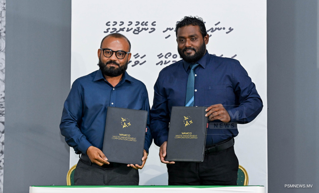 ޅ. ނައިފަރު ކުނި މެނޭޖުކުރުމުގެ މަސައްކަތް ވެމްކޯއާއި ހަވާލުކުރުމުގެ އެއްބަސްވުމުގައި ވެމްކޯގެ މެނޭޖިންގ ޑިރެކްޓަރ މުޖްތަބާ ޖަލީލު އަދި ނައިފަރު ކައުންސިލްގެ ރައީސް މުޙައްމަދު ރަޝީދު އަހްމަދު ސޮއިކުރެއްވުން / ފޮޓޯ - ރައީސް އޮފީސް