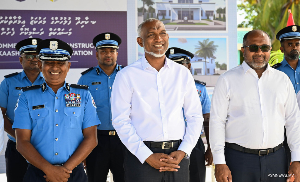 ކ. ކާށިދޫގައި އިމާރާތްކުރާ ފުލުހުންގެ މަރުކަޒުގެ ޢަމަލީ މަސައްކަތް ފެށުމުގެ ރަސްމިއްޔާތުގައި ރައީސުލްޖުމްހޫރިއްޔާ ޑރ. މުޙައްމަދު މުޢިއްޒު ބައިވެރިވެވަޑައިގަންނަވަނީ / ފޮޓޯ - ރައީސް އޮފީސް