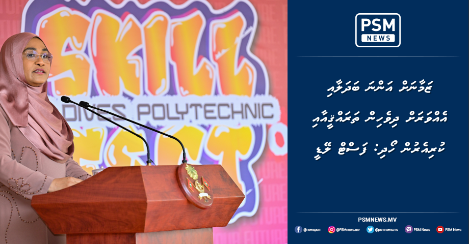 މޯލްޑިވްސް ޕޮލިޓެކްނިކަށް 50 އަހަރު ފުރުމާއި ދިމާކޮށް ބާއްވާ، ސްކިލް ފެސްޓް ހުޅުވުމުގެ ރަސްމިއްޔާތު ޝަރަފުވެރިކޮށްދެއްވާ ވަހަކަފުޅު ދައްކަވަމުން ރައީސުލްޖުމްހޫރިއްޔާގެ އަނބިކަނބަލުން ސާޖިދާ މުޙައްމަދު ވިދާޅުވީ މޯލްޑިވްސް ޕޮލި ޓެކްނިކްގެ ސްކިލް ފެސްޓަކީ ދިވެހި މަސައްކަތްތެރިކަމުގެ ހުނަރުތައް ދަސްކުރުމަށް ހުޅުވިފައިވާ ދޮރެށް ކަމަށެވެ. އެހެން ކަމުން ކޮންމެ ޒުވާނަކުވެސް މި ފުރުޞަތުގެ ބޭނުން ހިފާނެ ކަމަށް ޤަބޫލުކުރައްވާކަމަށް އެކަމަނާ ވިދާޅުވިއެވެ.