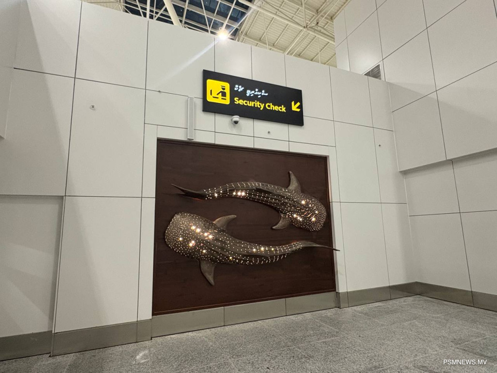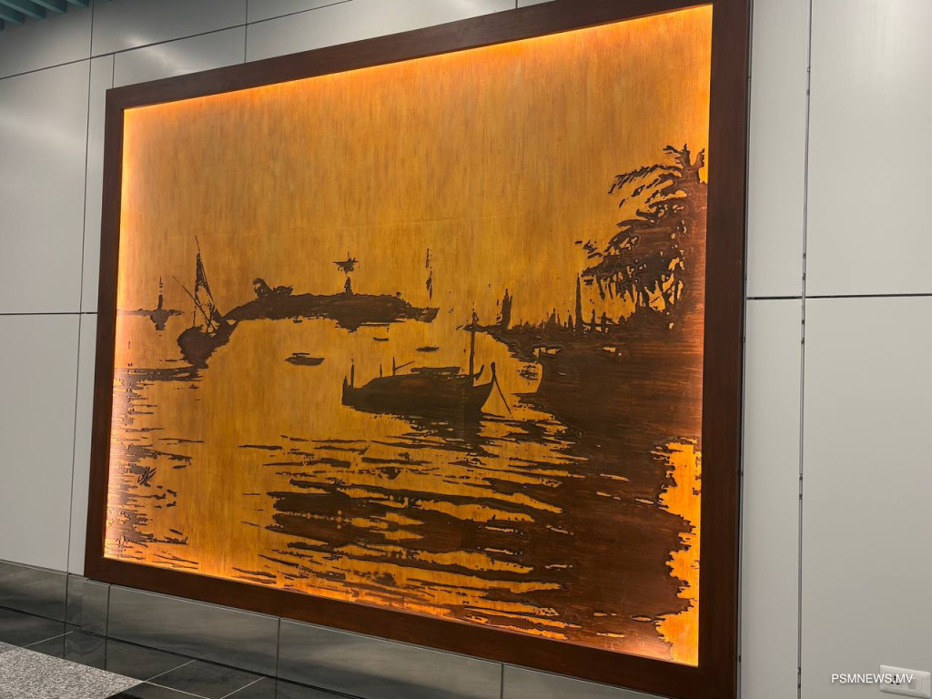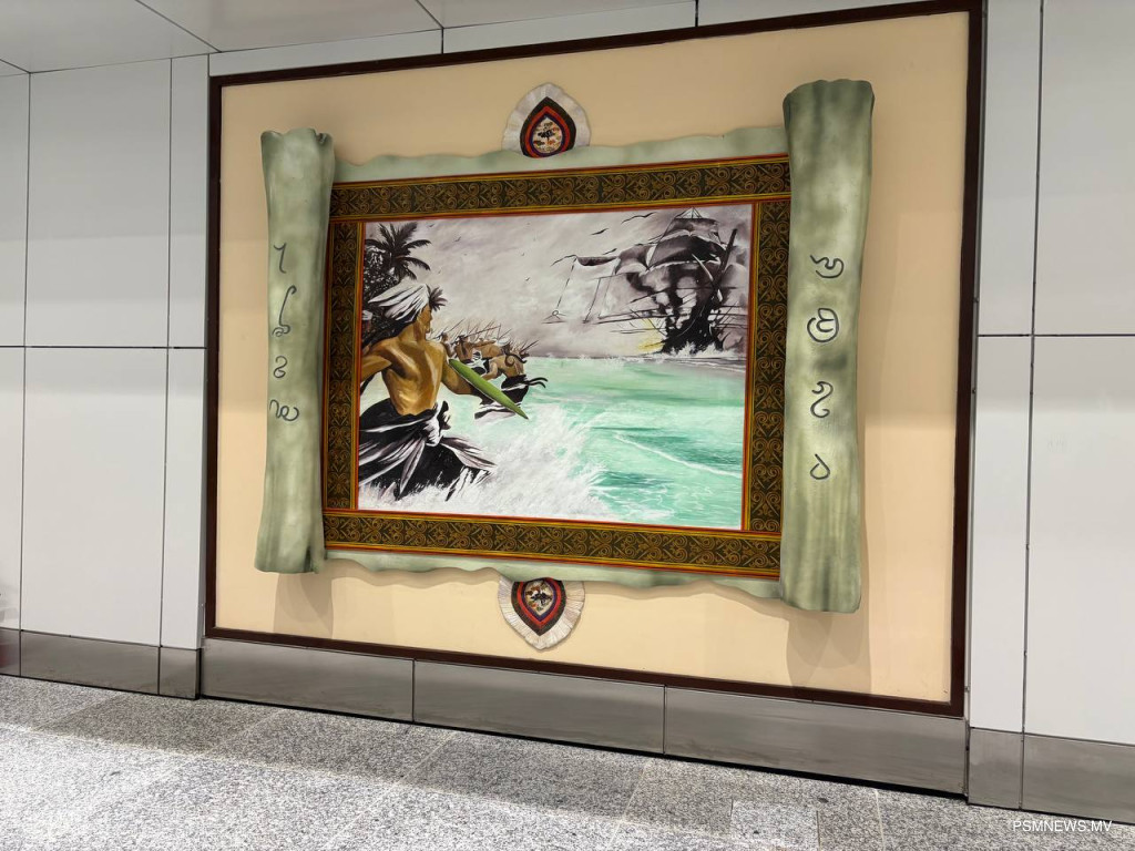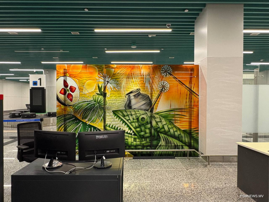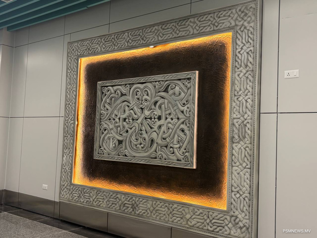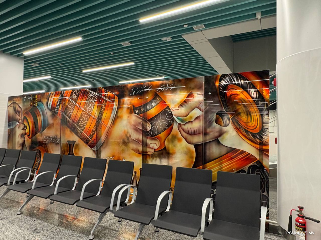 ޓަރމިނަލުން ބޭރަށް ނިކުންނަ ގޭޓު ކައިރީގައި، ދިވެހިބަހުގެ އަސްލުކަމަށްވާ ތާނަ އަކުރުތަކާއި، ދިވެހި ތާރީޚުގެ މުހިންމު ބައެއްކަމަށްވާ ލޯމާފާނު އަދި ދިވެހި ސަޤާފަތުގައި ބޭނުންކުރާ ސަންގު ހިމަނައިގެން ކުރަހާފައިވާ ރީތި މަންޒަރެއް ފެންނާނެއެވެ. މި ކުރެހުމަކީ ދިވެހިބަހާއި ތާރީޚަށް ދެވޭ ޤަދަރެއްގެ ގޮތުގައި ފާހަގަކުރެވެއެވެ.
