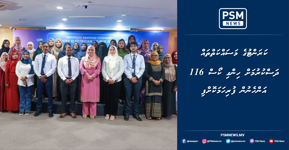 ސްޓެލްކޯއިން ކުރިއަށްގެންދިޔަ ފަށާ ފެންވަރުގެ ކަރަންޓު މަސައްކަތުގެ ކޯސް “ބިގިނަރސް އިލެކްޓްރިކް ކޯސް ފޯ ވިމަން” 116 އަންހެނުން ފުރިހަމަކޮށްފިއެވެ. މި ރަސްމިއްޔާތު ޝަރަފުވެރިކޮށްދެއްވާ ބައިވެރިންނަށް ސެޓްފިކެޓް ހަވާލުކޮށްދެއްވީ ރައީސުލްޖުމްހޫރިއްޔާގެ އަނބިކަނބަލުން ސާޖިދާ މުޙައްމަދުއެވެ.