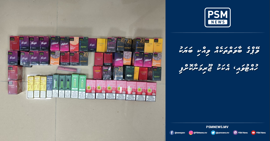 އިލެކްޓްރޯނިކް ސިނގިރެޓާއި، ވޭޕް ކުރުމަށް ބޭނުންކުރާ އާލާތްތައް ރާއްޖެއަށް އެތެރެކުރުން މަނާކުރި ފަހުން، މިހާތަނަށް 53،000 އަށްވުރެ ގިނަ ވޭޕް ސާމާނު ހިފެހެއްޓިފައިވާ ކަމަށް މޯލްޑިވްސް ކަސްޓަމްސް ސަރވިސްއިން މިދިޔަ މަހު ހާމަކޮށްފައިވެއެވެ.