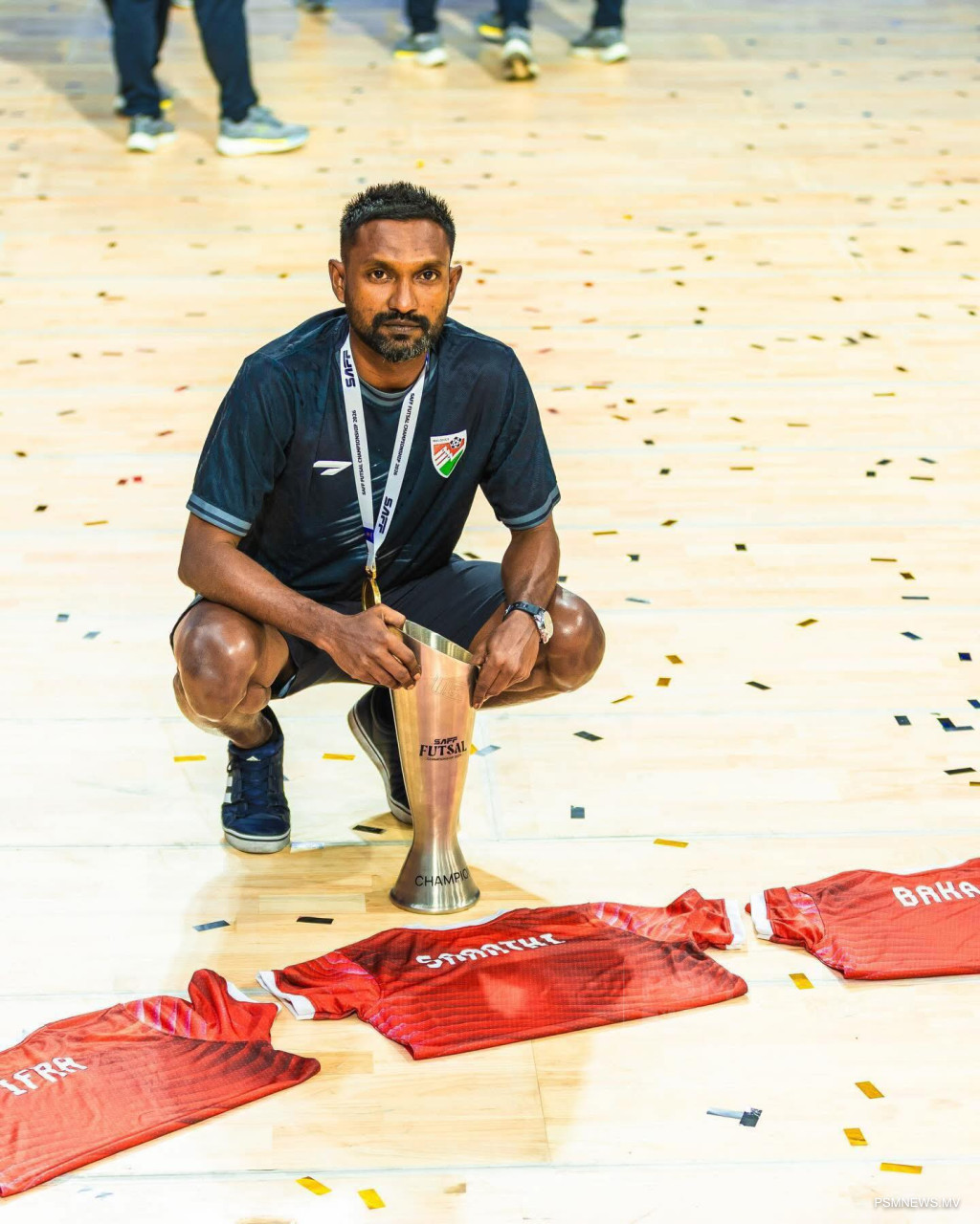 ރާއްޖެއިން ފުޓްސަލްގައި ހޯދި ފުރަތަމަ ރަން މެޑަލް ކަރުގައި އަޅުވައިގެން ހުރެ ނަގާފައިވާ ފޮޓޯއެއް އުމެއިރު މީސްމީޑިއާގައި ހިއްސާކުރިއިރު، އޭނާގެ ކުރިމަތީގައި ޤައުމީ ފުޓްސަލް ޓީމުގެ ތިން ޖާޒީއެއް އޮތެވެ. އެ ތިން ޖާޒީގައި ވަނީ، އުމެއިރުގެ މި ކާމިޔާބީ ޚާއްސަކޮށްފައިވާ ތިން ޝަހުސިއްޔަތުގެ ނަމެވެ.