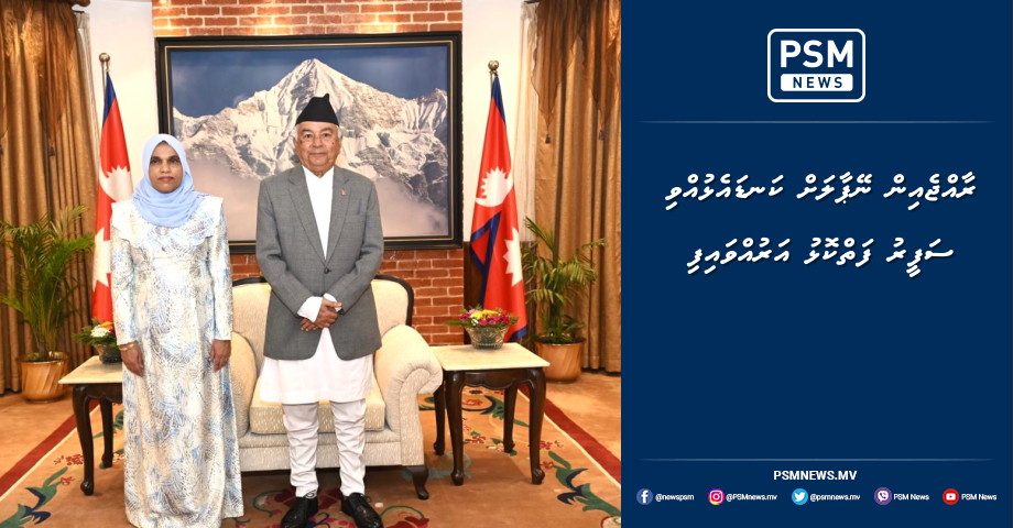 ދިވެހިރާއްޖެއިން ނޭޕާލަށް ކަނޑައަޅުއްވާ ނޮން-ރެޒިޑަންޓް ސަފީރުކަމުގެ މަޤާމާ ޢާއިޝަތު އަޒީމާ ޙަވާލުވެ ވަޑައިގަތުމުން، އެ ކަމަނާއަށް ނޭޕާލުގެ ރައީސް ވަނީ ތަހުނިޔާ ވިދާޅުވެފައެވެ. އަދި ދިވެހިރާއްޖެއާއި ނޭޕާލްއާ ދެމެދު އޮތް ގާތްގުޅުން އިތުރަށް ބަދަހި ކުރުމުގެ މަސައްކަތުގައި ސަފީރުގެ ފުރިހަމަ އެއްބާރުލެއްވުން ލިބިވަޑައިގަންނަވާނެ ކަމަށް އުންމީދު ކުރައްވާ ކަމުގައި ވިދާޅުވިއެވެ. މި ބައްދަލުވުމުގައި ނޭޕާލުގެ ރައީސް އެކަމަނާއަށް ވިދާޅުވި ހޫނު މަރުހަބާއަށް ސަފީރު ޝުކުރު އަދާކުރެއްވިއެވެ. އަދި ރައީސުލްޖުމްހޫރިއްޔާ ޑރ. މުޙައްމަދު މުޢިއްޒުގެ ފަރާތްޕުޅުންނާއި، ދިވެހި ސަރުކާރާއި، ރައްޔިތުންގެ ފަރާތުން ނޭޕާލުގެ ރައީސްއަށާއި، އެ ޤައުމުގެ ރައްޔިތުންނަށް ހެޔޮ އެދުމާއި ތަހުނިޔާ ރައްދު ކޮށްދެއްވިއެވެ.
