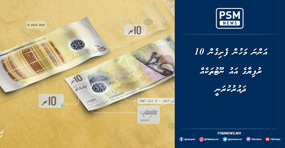 10 ރުފިޔާގެ ސްޓޮކް މަދުވުމާއި ބައުވެ ހަލާކުވާ ނޫޓުތައް އައުކުރުމަށް ރަންދިހަ ފަހެއް ސީރީޒްގެ 10 ރުފިޔާގެ އައު ޗާޕެއް މޯލްޑިވްސް މަނިޓަރީ އޮތޯރިޓީ (އެމްއެމްއޭ) އަށް ގެނެސްފިއެވެ.