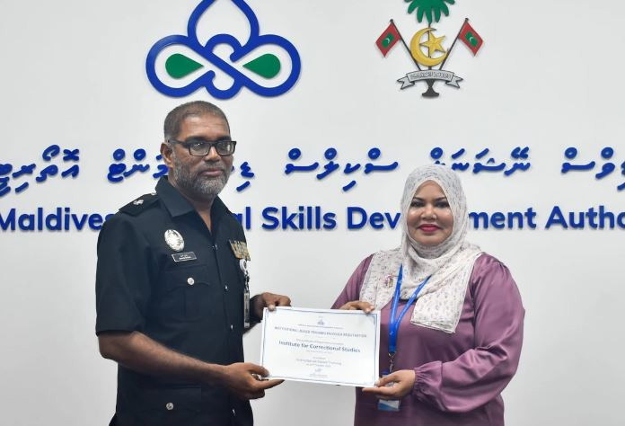 The institute registration certificate was presented during a ceremony held on Sunday by Dr Zahra Mohamed, Chief Executive Officer of MNSDA. Superintendent Ibrahim Nashid received the certificate on behalf of the Institute for Correctional Studies.